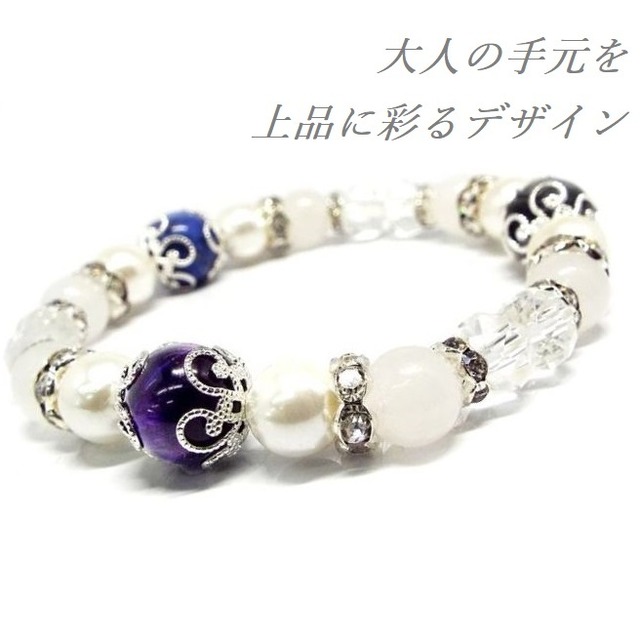 天然石 バンデットアゲート 紫藍縞瑪瑙 シェルパール ブレスレット【お届まで3~21日】 【1サイズのみ】 バンデットアゲート(紫藍縞瑪瑙)×シェルパール ブレスレット 深みのある紫藍色が美しい「バンデットアゲート(紫藍縞瑪瑙)」と、上品な光沢を放つ「シェルパール」を組み合わせた特別なアクセサリー。 バンデットアゲートとシェルパールの組み合わせは、色彩と質感のコントラストが絶妙で、幅広いファッションに溶け込みながら存在感を放ちます。たとえば、白シャツにデニムというシンプルなカジュアルスタイルに合わせると、程よく大人の落ち着きをプラス。紫藍の深みがシンプルコーデの中でアクセントとなり、洗練された印象を与えてくれます。 オフィススタイルでは、ネイビーやグレーのスーツと相性抜群。シェルパールの柔らかな光沢が知的な雰囲気を引き立て、手元をさりげなく上品に彩ります。会議や商談の場で落ち着きと信頼感を演出したい方におすすめです。 また、ドレスやワンピースなどのフォーマルスタイルには、パールの気品が全体のコーディネートを格上げ。紫藍の色合いは和装との相性も良く、振袖や訪問着に合わせると現代的なアクセントとして引き立ちます。 さらに、シルバーアクセサリーや時計との重ね付けもバランスが良く、ユニセックスで楽しめるのも魅力。普段のお出かけから特別なシーンまで、一本で多彩なコーディネートに対応できる万能アイテムです。 内周:約16cm / Inner circumference: 16 cm (approx. 6.3 inches) 玉サイズ:バンデットアゲート 紫藍縞瑪瑙 約10mm・約6mm シェルパール 約8mm ※1.内周とはブレスレットの内側で測ったまわりの長さ ※2.強く引っ張ると破損する場合がございますので注意してください。 ※3.ご注文から商品の発送まで7日以上かかる場合がございます。 ※4.落とすと破損します。 ※5.天然石のため同じものでも色味・模様などが異なります。 ※6.照明の具合で実際とは色合いが異なる場合がございます。 また、天然素材特有のクラック・内包物を有する場合がございます。予めご了承下さい。