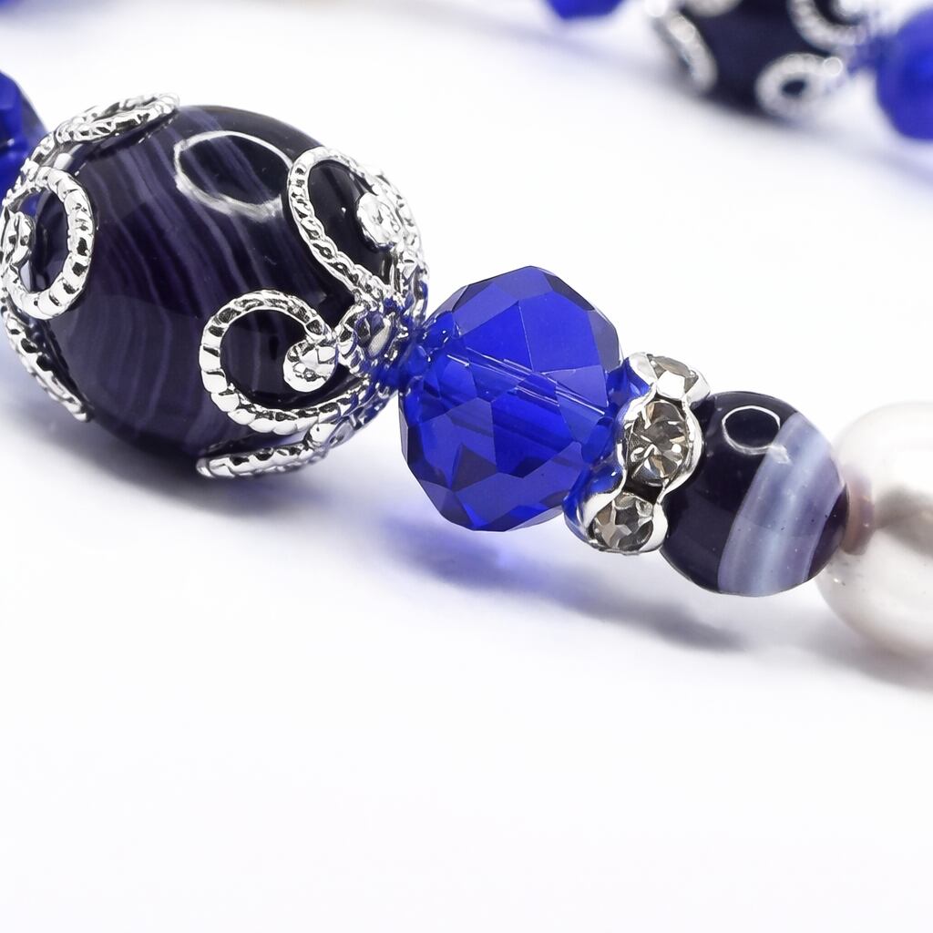 深みのある紫藍色が美しい「バンデットアゲート(紫藍縞瑪瑙)」と、上品な光沢を放つ「シェルパール」を組み合わせた特別なアクセサリー。