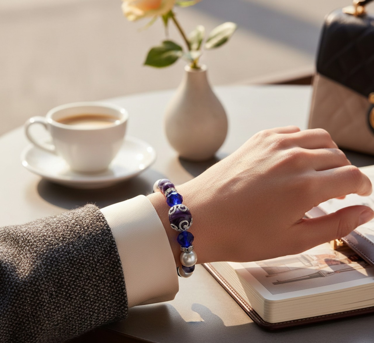 バンデットアゲートとシェルパールの組み合わせは、色彩と質感のコントラストが絶妙で、幅広いファッションに溶け込みながら存在感を放ちます。たとえば、白シャツにデニムというシンプルなカジュアルスタイルに合わせると、程よく大人の落ち着きをプラス。紫藍の深みがシンプルコーデの中でアクセントとなり、洗練された印象を与えてくれます。