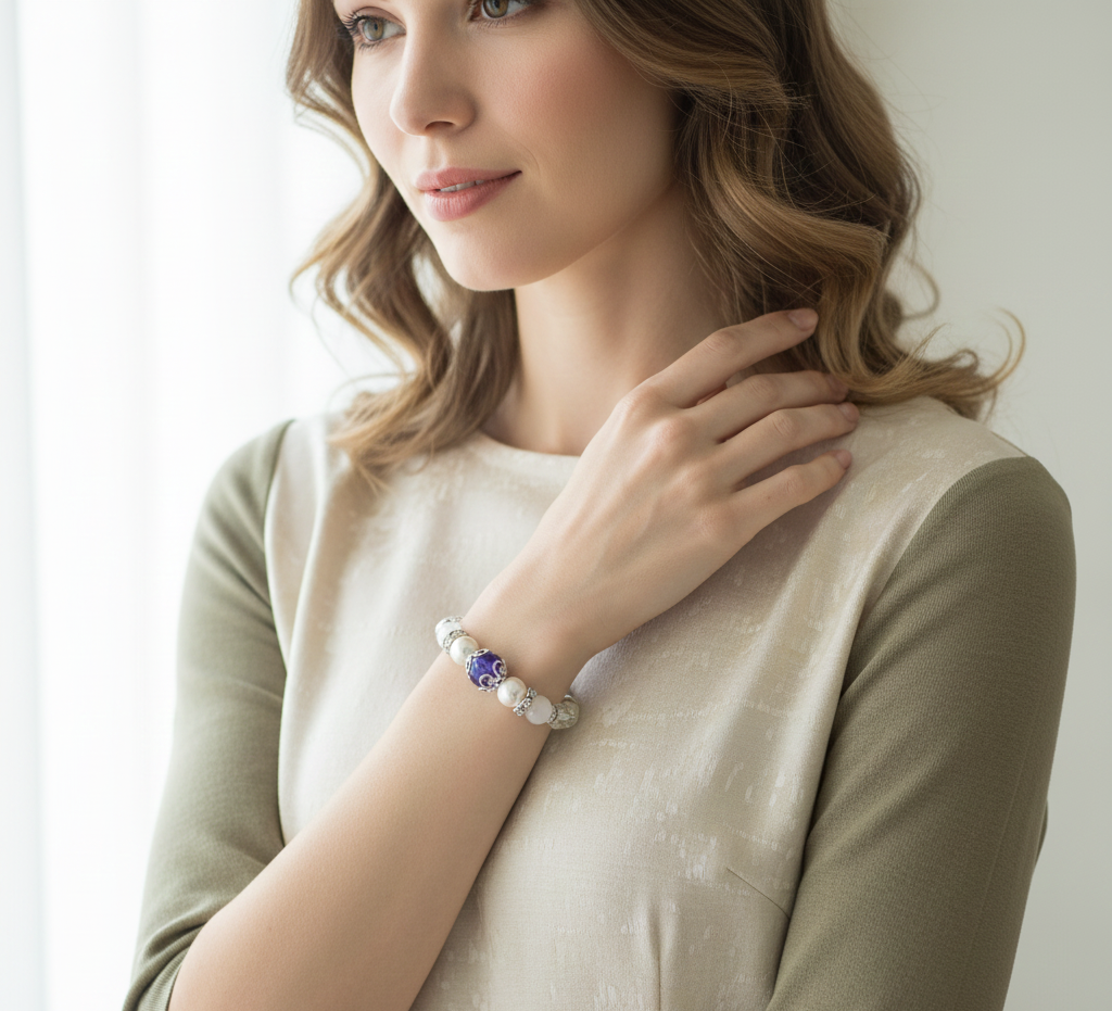 40代・女性: このブレスレット、手元をすごく華やかに見せてくれるので、ラウンドウェアが一段とおしゃれに見えると仲間から好評です!特にパープルのアクセントが効いています。